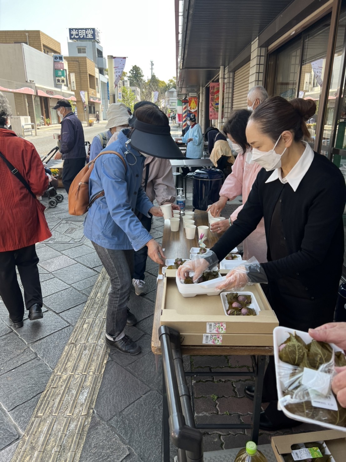 4月八日市は桜餅を150人に振る舞いました。5月は柏餅を配ります。